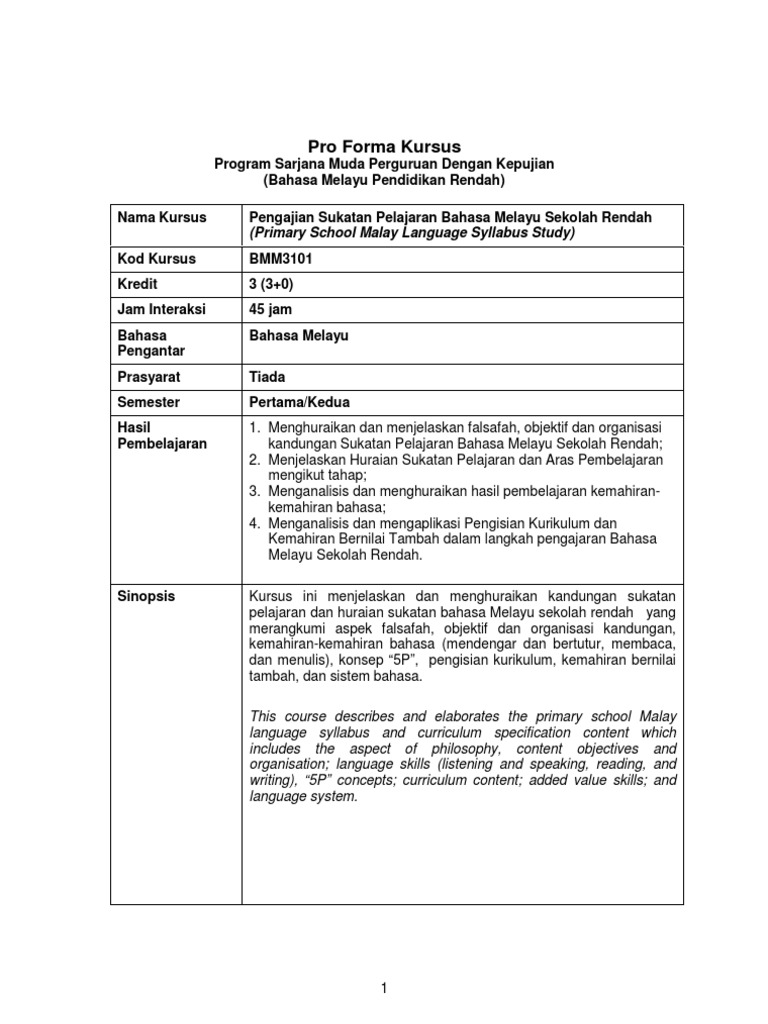 Pro Forma Bmm 3103 Sukatan Pelajaran Bm Sr Pdf